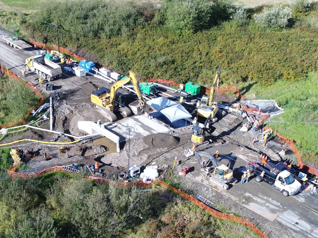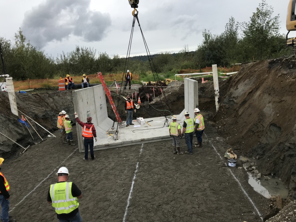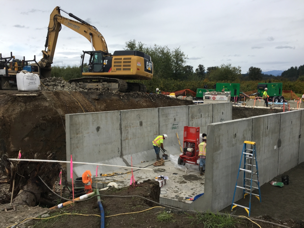 Our team served as the General Contractor to WSDOT for the installation of a new fish passage for Langlois Creek under SR 203 in Carnation. The new 19-foot-wide concrete culvert (i.e., new fish passage) replaced the existing 30-inch diameter culvert. The new (and larger) culvert improved stream flow for local salmon and steelhead, opening up about five and a half miles of new fish spawning habitat.