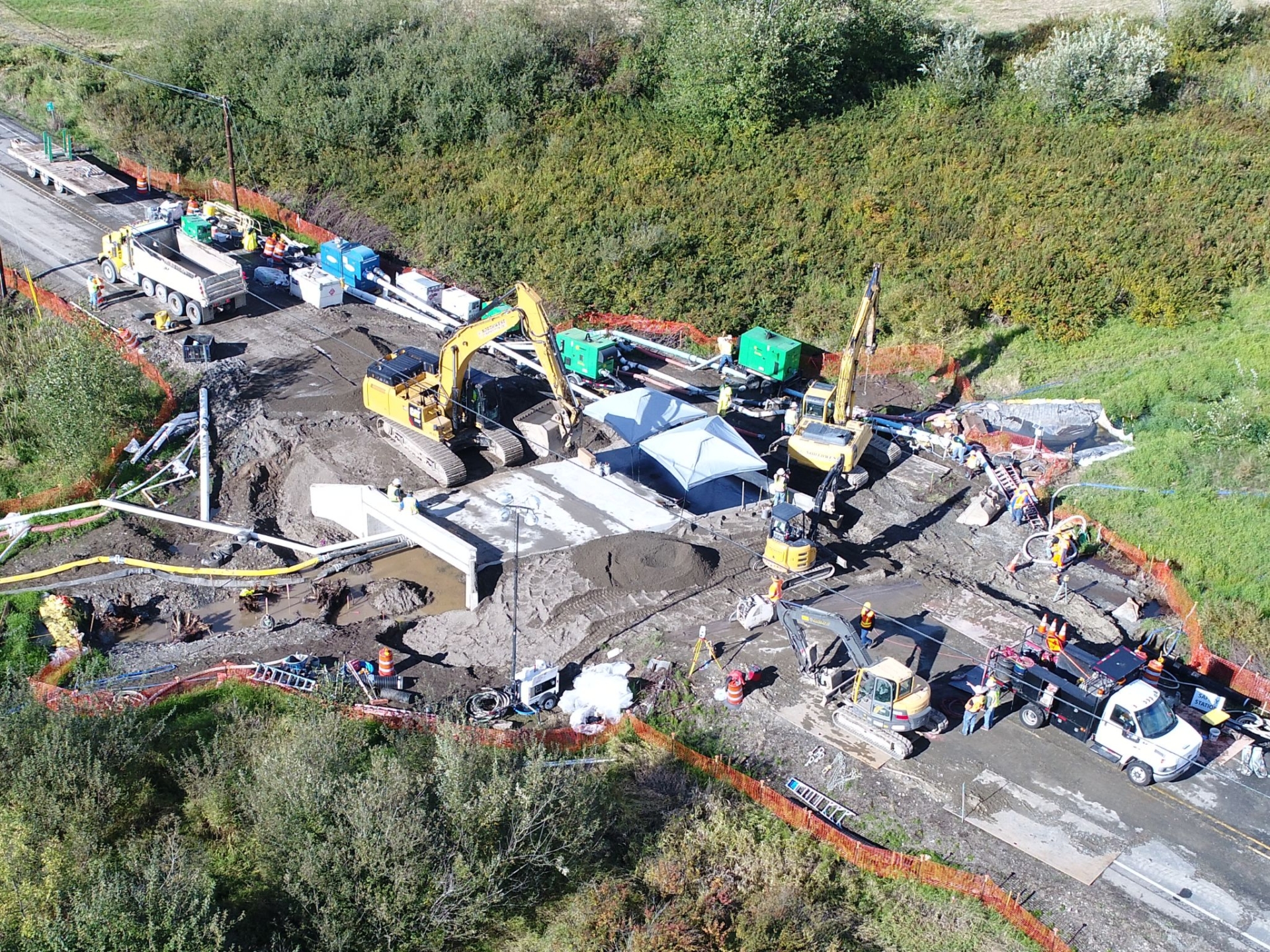 We were responsible for clearing and grubbing, stream diversion, dewatering, lowering of the existing watermain, removal of existing culvert, installation of the new fish passage, guardrail, fencing, asphalt paving, channelization, and stream restoration.